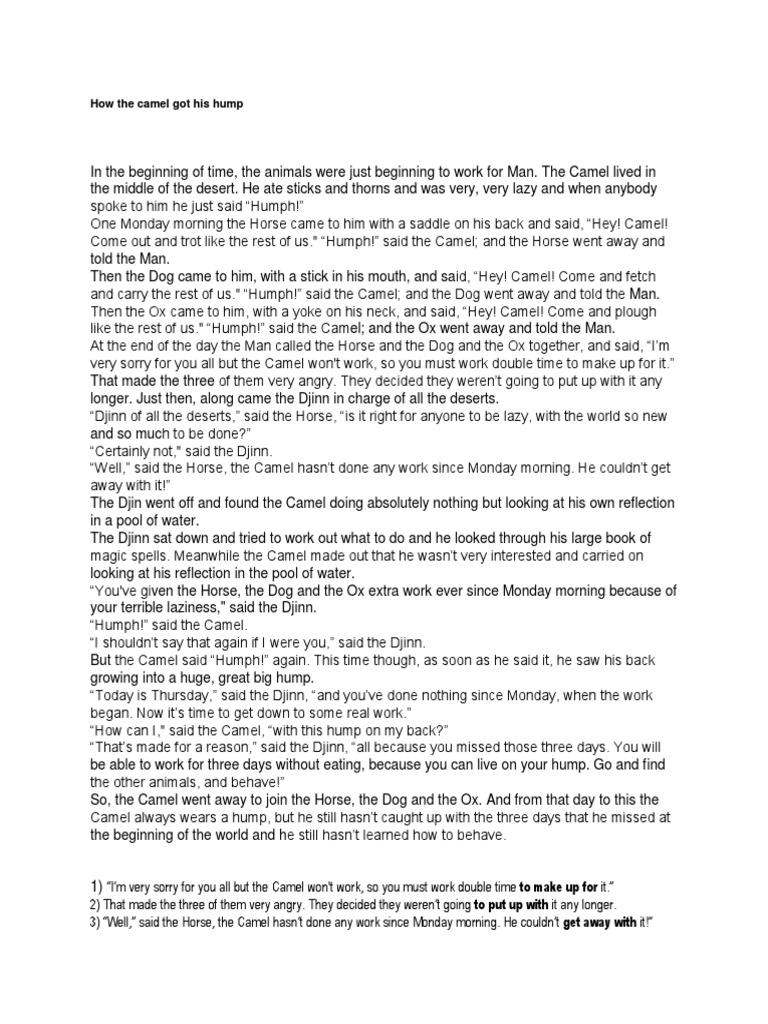 How The Camel Got Its Hump Worksheets Teaching Resources Tpt from ecdn.teacherspayteachers.com See our fully illustrated just so story books on amazon. And besides, he was a. L read page 3 and the chapter expressively to the class (or play the audio download). Also includes sites with a short overview, synopsis, book report, or summary of tim raglin's how the camel got his hump. the djinn told the camel about the purpose of the hump. But camel stubbornly refuses, telling them, humph! Savesave how the camel got his hump.docx for later. It seems that the camel still did not behave himself and worked lazily in the desert itself.