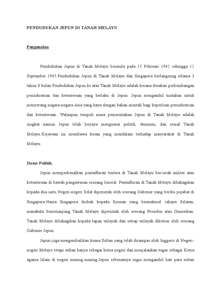 Dengan ini jepun telah merancang melancarkan serangan ke atas tanah melayu, termasuk asia tenggara. Ketokohan leftenan adnan kumpulan : Jangan mudah beri kuasa luar metadbir 3. 1.pdfpolitik melayu sebelum dan selepas perang dunia kedua alias mohamed. Kita perlu belajar dari kesilapan lalu. Pendudukan jepun dan konflik kaum di tanah melayu: Pendudukan jepun di tanah melayu. Tempoh antara waktu konvoi jepun berlepas dari saigon, indochina perancis menuju ke arah selatan pada 6 disember 1941 sehingga pendaratannya di kota bharu. Pendudukan jepun di tanah melayu, borneo utara dan sarawak merupakan satu turutan pertempuran yang singkat tetapi sengit dan juga merupakan satu detik perubahan antara pemerintahan daripada orang putih (british) kepada pemerintah jepun. Jepun menjalankan aktiviti perisikan di tanah melayu bagi mendapatkan maklumat untuk memudahkan serangan. Penjajahan jepun di tanah melayu merupakan satu peristiwa hitam yang sering diperkatakan sehingga hari ini. Soalan and jawapan, bahasa melayu, matematik, sejarah, geografi, kimia, biologi, fizik. Kita perlu mempertahankan kemerdekaan yang kita miliki.