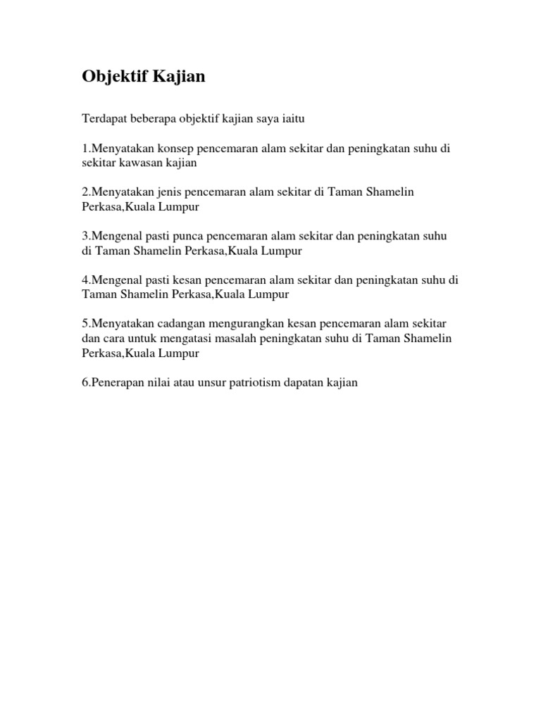 Related : Objektif Kajian Pencemaran Alam Sekitar - Objektif kajian objektif kajian saya ialah mengkaji konsep pencemaran alam sekitar di kawasan ss 13 , subang jaya..