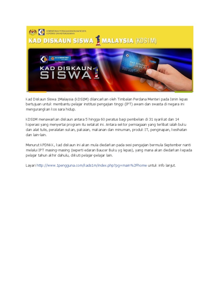 1 from Oct 05, 2012 · kad diskaun siswa 1 malaysia (kds1m) diperkenalkan dengan tujuan untuk membantu pelajar ipta dan ipts menghadapi kenaikan kos harga barangan. Antara diskaun yang bakal dinikmati oleh para siswa dengan kad diskaun siswa 1malaysia adalah seperti kat bawah ni : Nov 01, 2017 · the 1malaysia student discount card, sometimes known as the kad siswa or the kads1m, was established by the ministry of domestic trade, cooperatives and consumerism ministry (kpdnkk) with the objective to help alleviate the expenses of students in institutions of higher learning (ipt) public and private sectors across the country. One card two functions debit card and discount card accepted by mastercard merchants worldwide purchase at non halal categorized merchants are not allowed. Pelajar layak menerima bantuan bppt adalah digalakkan untuk membuat pembelian buku, alat tulis dan alatan komputer. Kad diskaun siswa 1malaysia ini merupakan kad yang memberi kemudahan kepada pelajar institusi pengajian tinggi (ipt) untuk menerima diskaun bagi pembelian barangan dan perkhidmatan daripada rakan dagang terpilih. Kad diskaun siswa 1malaysia (kds1m) juga akan diberi kepada pelajar sarjana dan doktor falsafah. Jul 20, 2017 · **what is kads1m (kad diskaun siswa 1malaysia)?** for the past few years, students in tertiary education have been receiving the 1malaysia book voucher or bantuan buku 1malaysia (bb1m) as the government aims to help the students to reduce the burden of academic books cost and others costs.