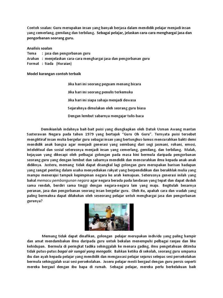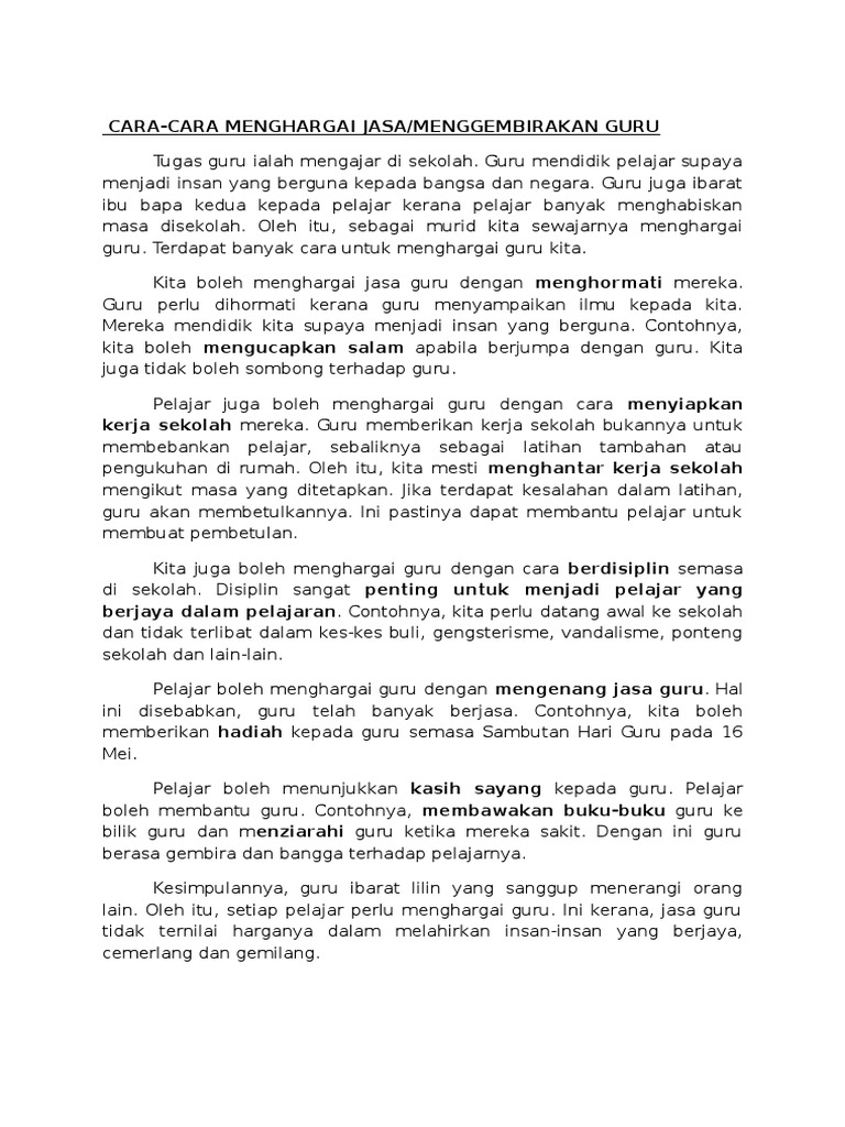 Ipendidikan » karangan » cara cara menghargai jasa guru (contoh karangan) disemak dan dikemaskini pada pukul 9:58 pm, 26 april 2020 cara cara menghormati guru karangan ini sangat baik untuk murid murid jadikan contoh terutama untuk kumpulan cemerlang. Nah, untuk mengenang jasa pahlawan tanpa tanda jasa tersebut. Contoh karangan apakah cara menghormati guru. Berikut dikongsikan contoh karangan bahasa melayu ujian pencapauan sekolah rendah (upsr) buat rujukan pelajar. Contoh karangan cara cara menghargai jasa dan pengorbanan guru pendahuluan. Menghormati guru berarti menghormati orangtua siswa sendiri. Adapun cara siswa menghargai dan menghormati guru : Bagaimana cara menghormati orang tua dan guru. Membantu pekerjaan rumah atau pekerjaan yang dapat meringankan beban orang tua. Sejak dua dan tiga dekad kebelakangan ini memang kita dapat menyaksikan bahawa adab menghormati guru di sekolah semakin dilupakan. Pelbagai cara boleh kita lakukan untuk menghormati guru. Cara menghormati orang tua yang masih hidup. Terms in this set (12).